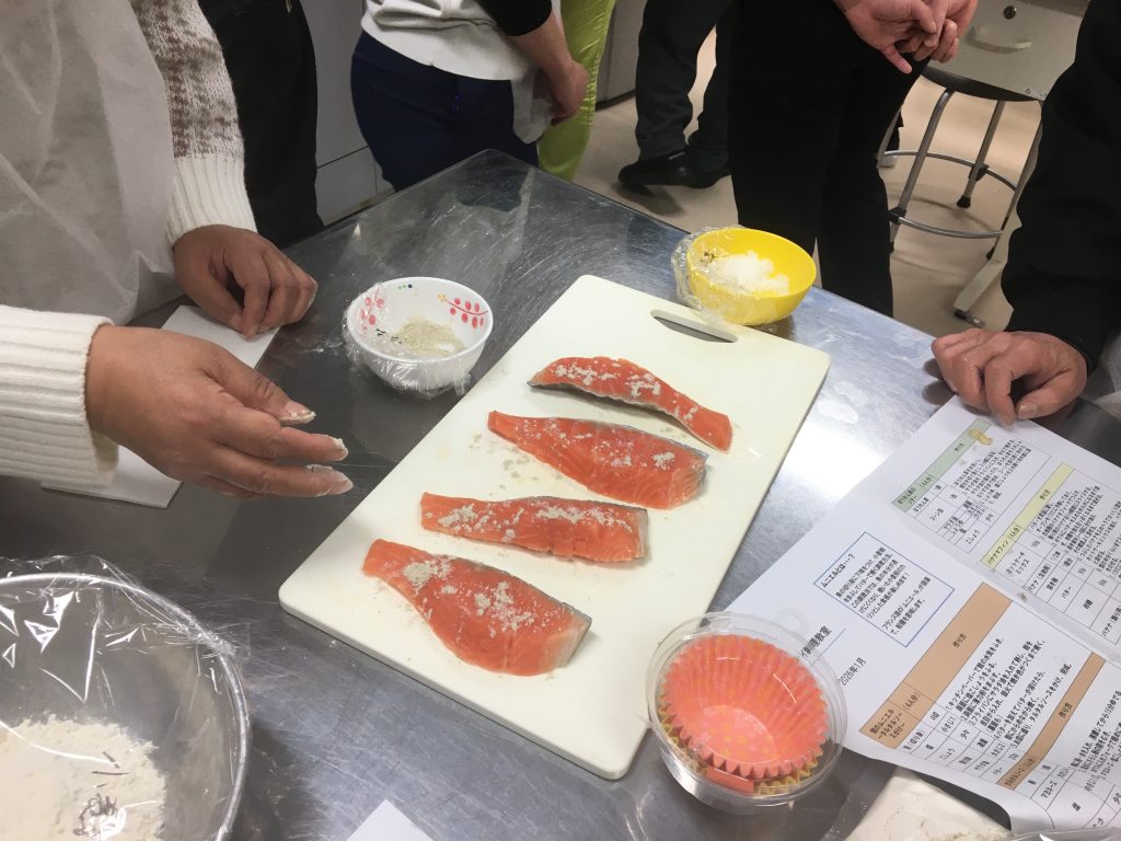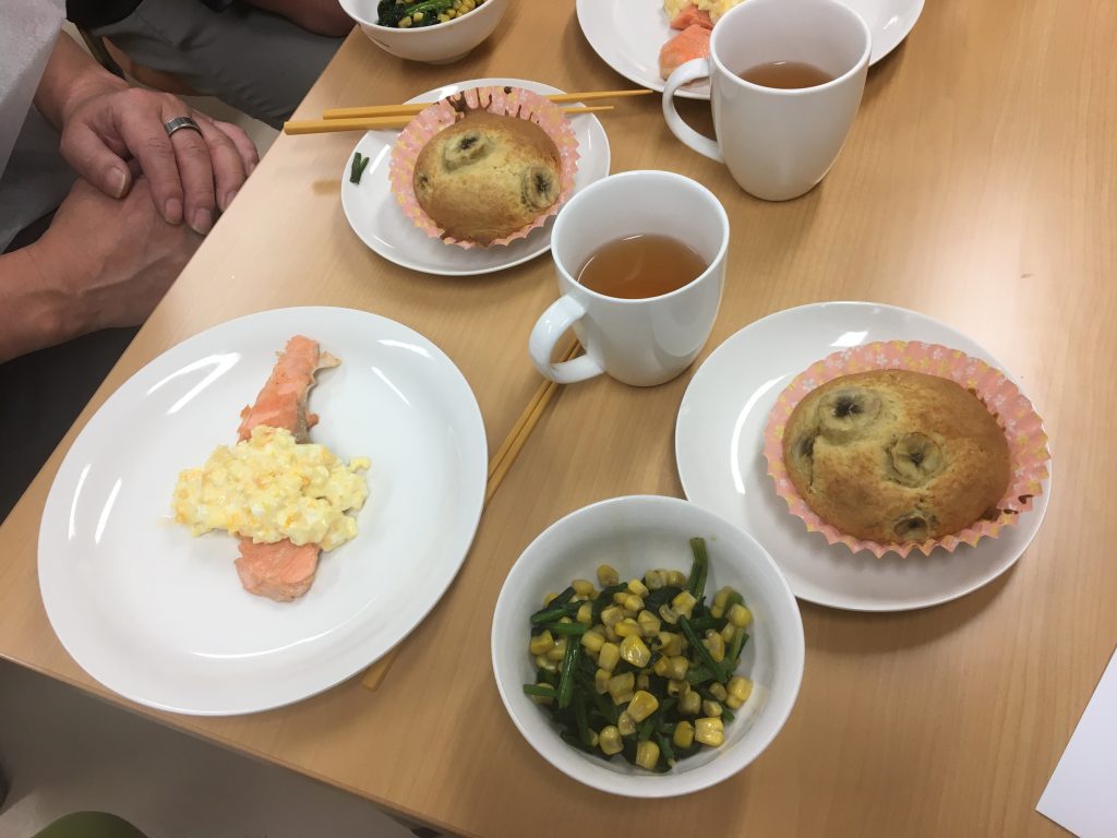 今月の料理教室は、鮭のムニエルタルタルソースかけ、ほうれん草のソテー、バナナマフィンでした。