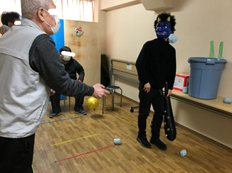 鬼の格好をしたスタッフが玉入れの邪魔をし、棍棒で球を打ち返したり、かごの前でポーズを取ったりして、メンバーさん達は大爆笑でした。